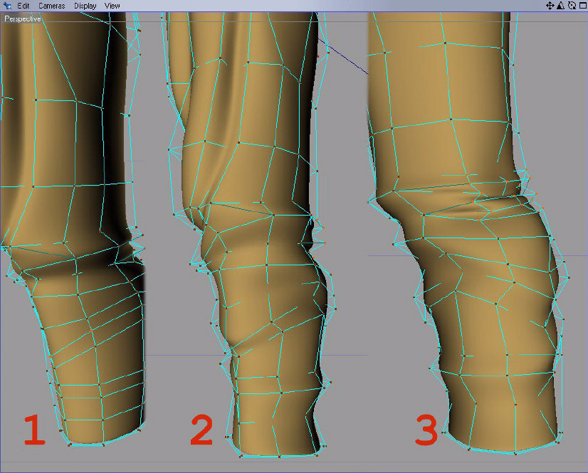 En la misma imagen podéis ver cómo se vuelven a crear los cortes para la siguiente arruga en el lateral del pantalón. Exactamente igual: tres cortes sobre el modelo donde queramos hacer la arruga y con la forma necesaria, y posteriormente se manipulan los puntos centrales para crear el relieve de la arruga. Después se ajustan los puntos necesarios hasta conseguir que quede a nuestro gusto (como veis, muy simple). También veis en esta imagen cómo se ha preparado la parte baja de la pierna (la pantorrilla) para crear las formas necesarias, lo cual podemos ver en la imagen 19. Aquí se puede apreciar la fase en la que se crean los cortes (1), la fase posterior de desplazamiento de puntos (2), y una vista más lateral de la parte trasera, donde se pueden apreciar la creación de las arrugas creadas en la parte posterior de la rodilla (3).