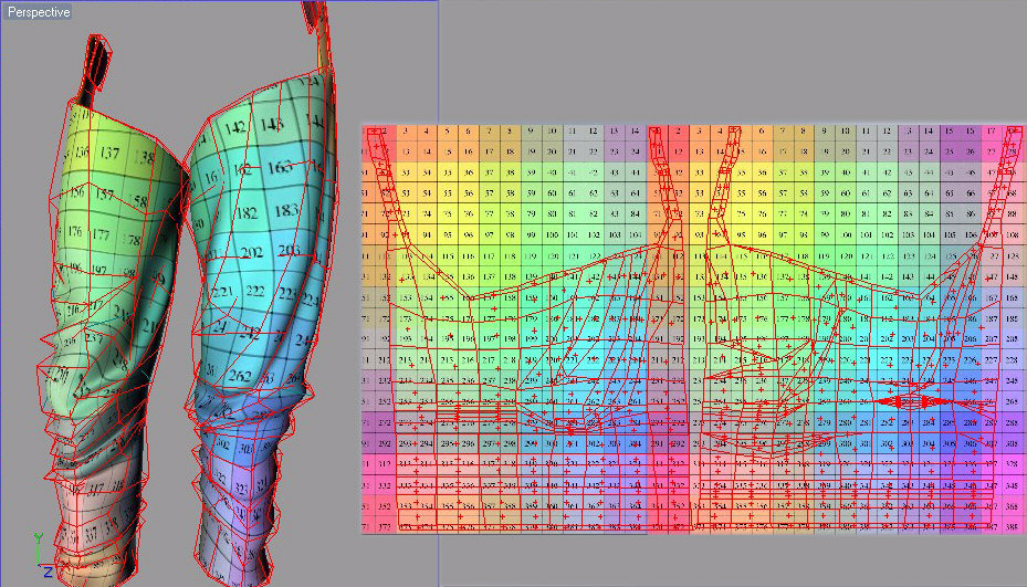 Esta tarea es un poco cansada, pero cuanto mejor preparemos la malla, mejores resultados obtendremos posteriormente, al aplicar nuestra textura o pintar sobre nuestro objeto. Como se ve en la imagen se ha ido seleccionando los diferentes puntos de la parte interior del modelo (superior e inferior) y se han desplazado, con el objeto de poder pintar posteriormente sobre ellos. También hemos desplazado los polígonos (usando la herramientas de ajuste) para que el corte de la textura o costura nos quede en un lateral del pantalón, en este caso la parte exterior del mismo, ya que se supone que ésta iría tapada con los flecos del pantalón (imagen 15).