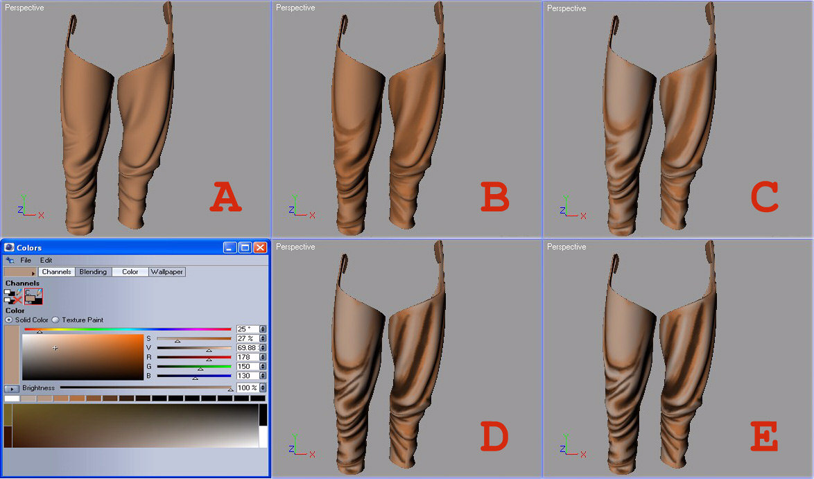 B: a continuación se crea otra capa y con una tonalidad más oscura del color base se dan las primeras sombras. Lo que tenemos que hacer es ir pintando sobre el modelo en las zonas de profundidad de las arrugas que se supone son zonas afectadas por la sombra. Yo uso una tableta y lo que hago es pintar con el pincel tipo Airbrush activando la sensibilidad de presión y de tamaño, de esta manera consigo un gran control sobre el trazado.