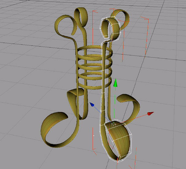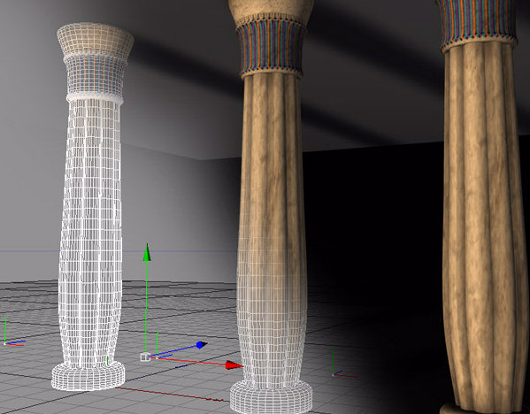 El capitel de la columna (porque las otras cinco son instancias giradas para que no parezcan la misma) está modelado a partir de un cilindro, con divisiones para dar forma, y metido dentro de un objeto Hypernurbs. Para el cuerpo de la columna dibujé en FreeHand la sección con la forma deseada y, una vez en Cinema, apliqué un forro Nurbs (con cuatro secciones incluidas dentro) variando la escala hasta conseguir la forma final.
