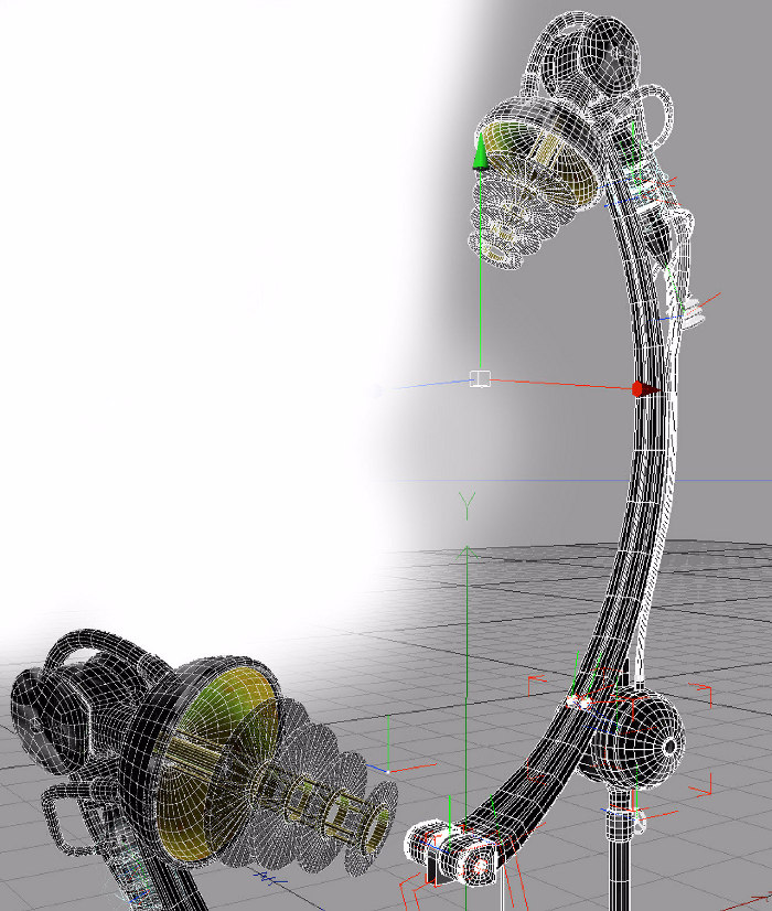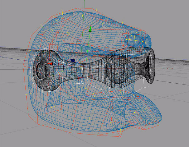 La estructura de los espejos y el casco también están realizadas partiendo de un objeto simple (para el primero un tubo y para el segundo una esfera), utilizando la herramienta de extrusión, todo ello metido en un objeto hipernurbs y, a su vez, en una simetría. Cuando trabajo de esta forma, una de las herramientas que más me ayudan a mantener depurada la escena es optimizar, ya que se crean polígonos que después se eliminan y no hay que olvidar que estas operación dejan como rastro puntos que después nos estorban.