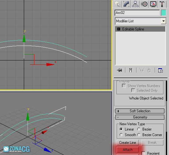 4) en el panel de modificadores (modify), ve a la sección geometry y presiona en attach. De este modo convertiremos al arco restante en editable Spline y ambos arcos pasaran a ser un mismo objeto.