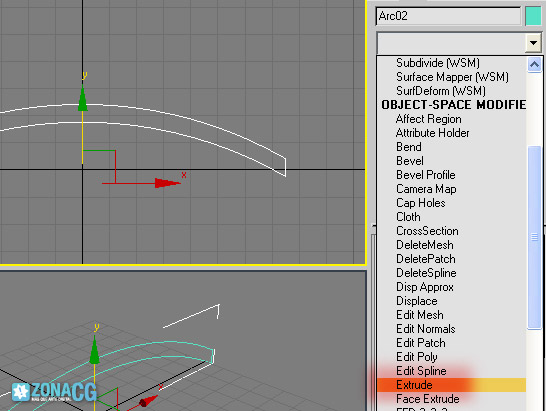 7) ahora le daremos volumen al arco. Ve al menú desplegable de modificadores y selecciona extrude tal cual lo muestra la imagen siguiente.