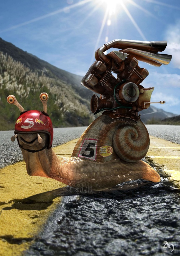 Por lo general suelo usar bastante fuentes de luz, las coloco en función de las necesidades de resaltar en mayor o menor medida detalles de la escena. En esta imagen he usado 13 luces; 4 luces omni cómo fuentes de luz de relleno, 2 para iluminar el motor frontalmente, 3 focos para iluminar el motor por detrás, 3 luces para acentuar el Specular y la sensación de grasa en el caparazón, una luz de foco detrás del cuello del caracol para el sub surface Scattering, más el sol con sombra de área y el cielo con un HDRI con un ambiente de características similares a la fotografía de la carretera para la iluminación global. Como suelo he usado un plano con una textura de asfalto y las líneas amarillas tan sólo con la intención de que se reflejara en el motor y añadiera algo de radiosidad al cuerpo del caracol y a las babas.