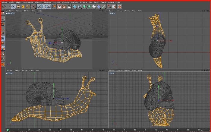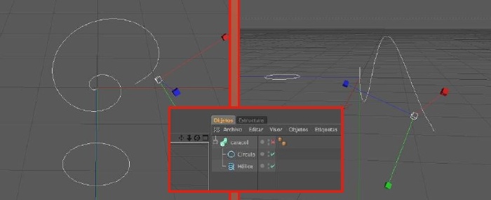 Comienzo por modelar el caparazón del caracol, para esto utilizo una Spline en espiral y una forma circular dentro de un Nurbs de recorrido, lo activo y voy ajustando los parámetros de la espiral hasta conseguir las vueltas necesarias, así como el grosor al principio y al final.