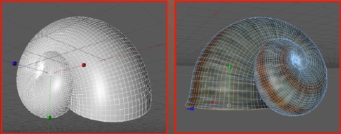Acoplo el caparazón sobre el cuerpo del caracol y practico varias deformaciones hasta ajustar ambos elementos. La cascara la estrecho, giro y deformo su abertura para adaptarla a las formas del lomo del caracol, el cuerpo lo retoco en el lomo para conseguir el efecto de que se mete dentro del caparazón. En este punto doy por terminado el trabajo de modelado básico en el cuerpo y caparazón.