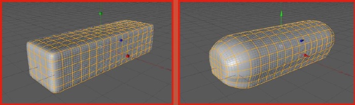 Para el modelado del cuerpo del caracol parto de una primitiva, un cubo al que doy varias subdivisiones y estiro para convertirlo en un rectángulo alargado que meto dentro de un Hypernurbs. Con las herramientas de polígonos y puntos voy deformándolo poco a poco para ir definiendo las formas básicas del cuerpo, también reduzco o amplio de tamaño algunos polígonos según necesite mayor o menos grosor en el modelo.