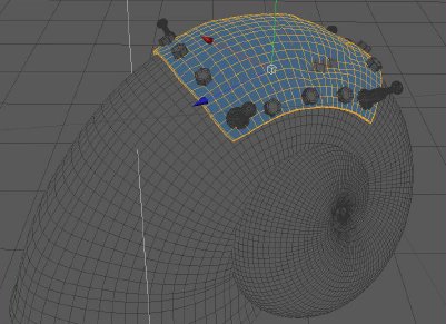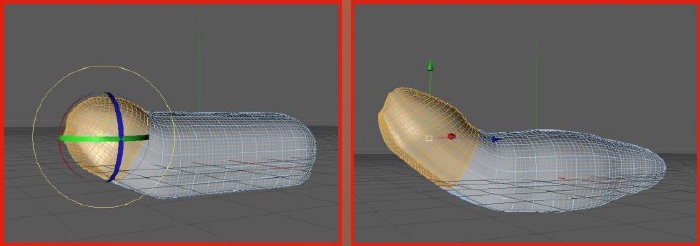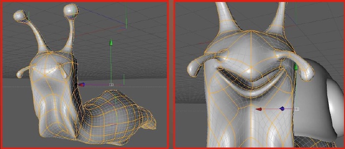 Para conseguir que el modelo se curve hago una selección de varios polígonos del extremo del modelo que me va a servir como cabeza y los giro y desplazo verticalmente, sigo deformando polígonos y puntos, giro, reduzco etc, hasta ir consiguiendo las formas definitivas del caracol.