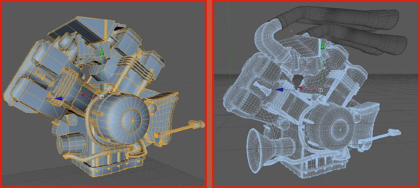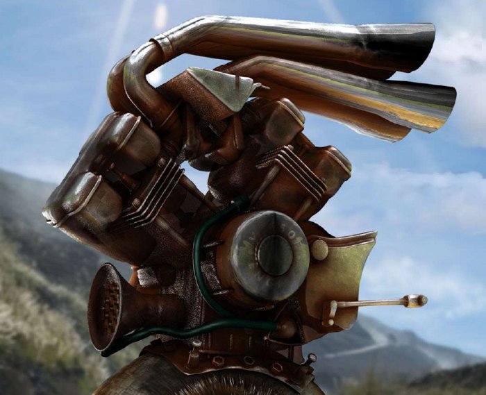 El motor es un modelo gratuito descargado de internet al que le he añadido muchos detalles y corregido algunas imperfecciones. Posteriormente lo he metido dentro de un Hypernurbs para que se redondearan todas las aristas y conseguir así un efecto de desgaste en todas las piezas del motor.