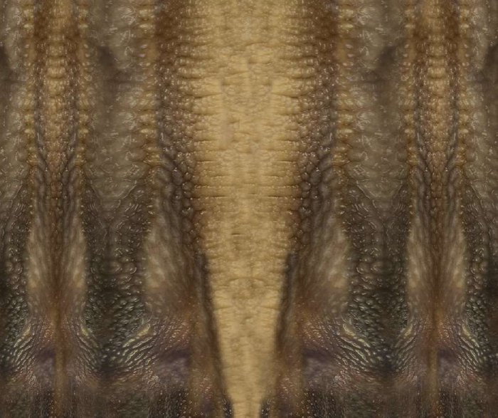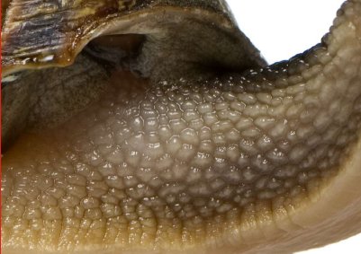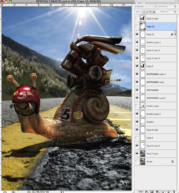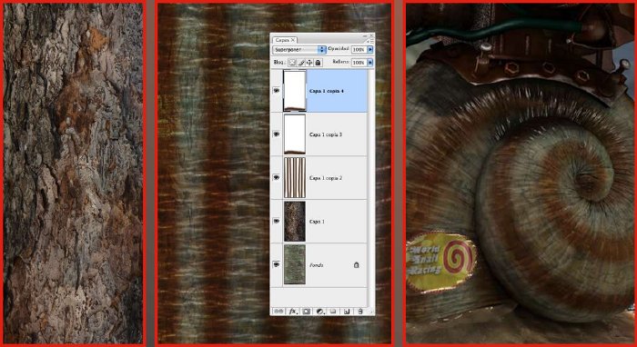 Para conseguir un efecto creíble en la textura del caparazón del caracol parto de una fotografía de un melón que clono varias veces en Adobe Photoshop hasta conseguir una buena base, luego hago una fusión con otra fotografía, en este caso un trozo de corteza de árbol, y finalmente añado unas líneas verticales pintadas en otra capa con aerógrafo, ajusto las capas con mayor o menor transparencia y en modo superponer. También hago una textura igual en bn para el ligero desplazamiento que aplico al caparazón.