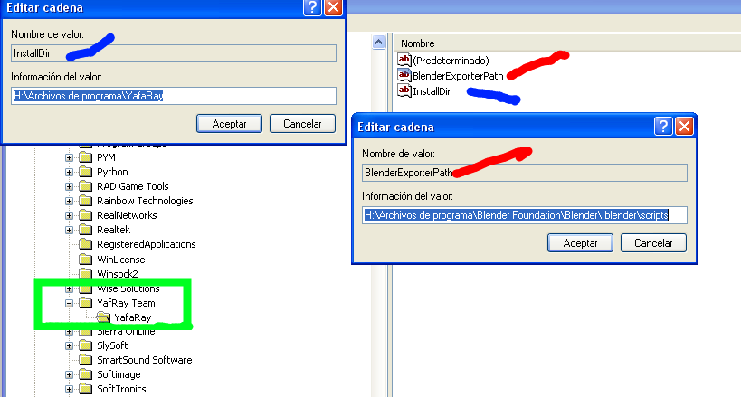 Desinstalar las versiones anteriores del programa, incluido, directorio de Yafray y los archivos de Yafray de la carpeta scripts de Blender (todos empiezan por YafRay).