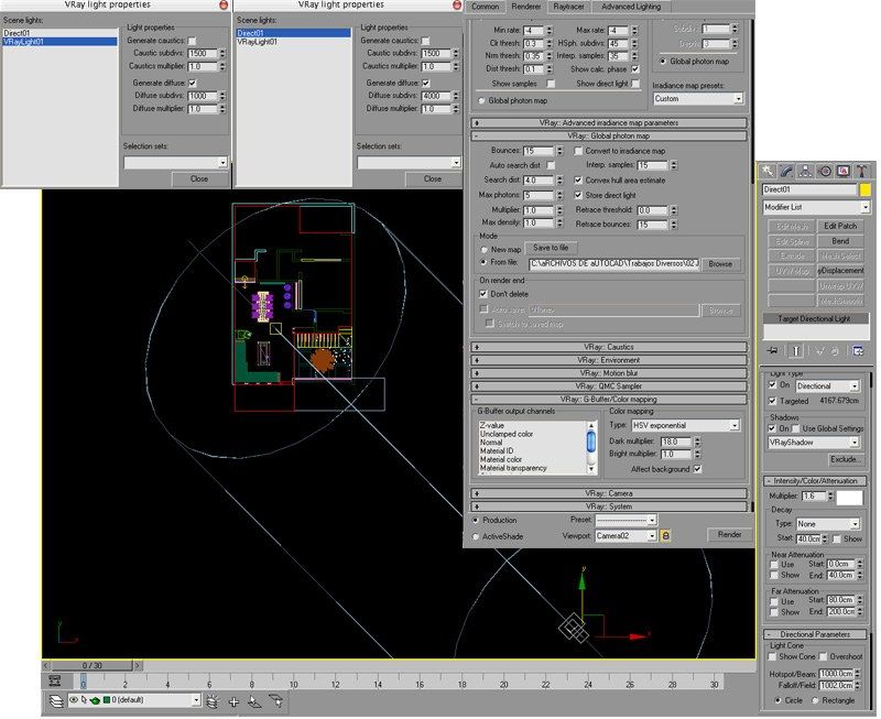 La escena está en centímetros, importada desde el CAD y construida en el 3ds Max, ahora tiene dos luces la escena.