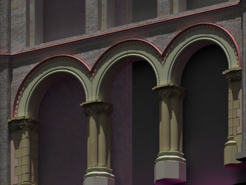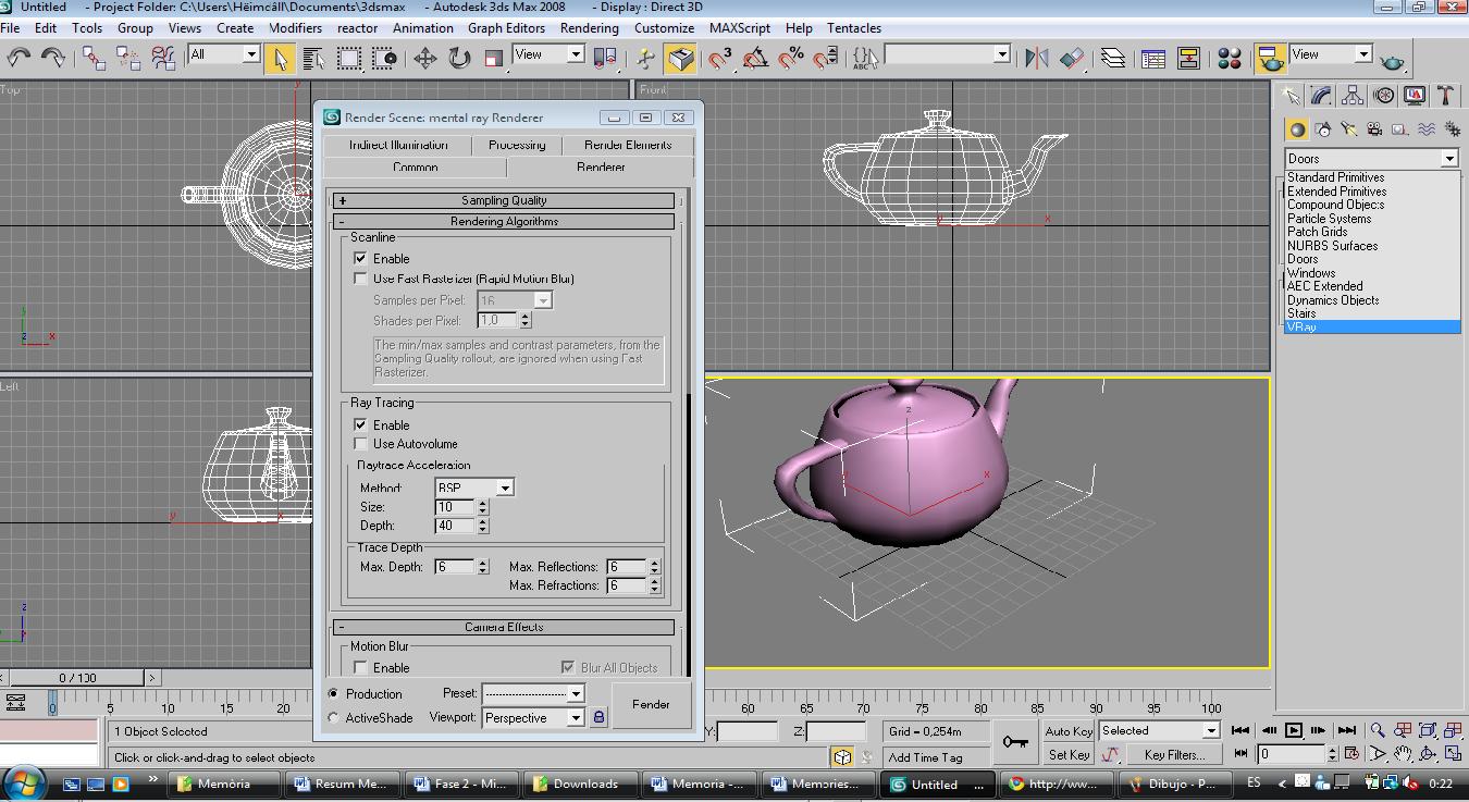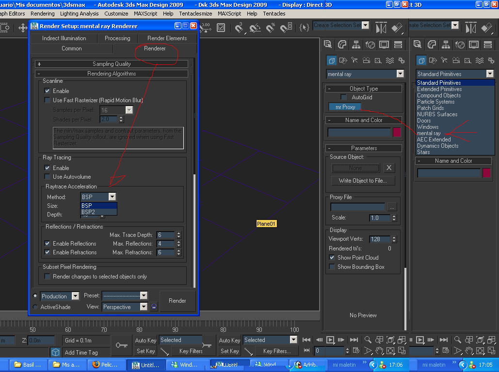 Bien, todo lo tengo ya modelado, colocado y texturizado, pero a la hora de iluminar, creo un ies_sun y un ies_sky para hacer luz general y destellos, siendo la Sun la que crea las sombras, y todo con el motor Mental Ray.