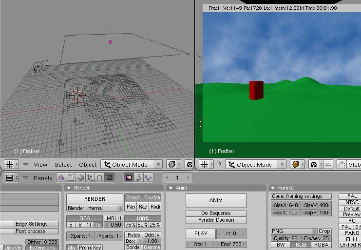 Es hora de hacer una prueba de render. Desde que las curvas del ipo son sólo una, y éstas están enlazadas a todas las plumas, arreglar cualquier error en los canales IPO, es tan simple como seleccionar una de las plumas, hacer cualquier cambio, y éste se traspasara a todas las otras plumas.