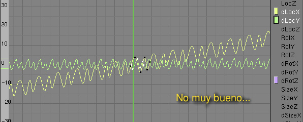 Continuando con nuestros ajustes, ahora que tenemos nuestra pluma dando vueltas sobre su eje de gravedad, necesitamos agregar el movimiento oscilante que es tan característico de este tipo de objetos. Para ello dlocx y dlocy, nos serán de mucha ayuda. Dibuja unas curvas ipo como las de la imagen, asegurándote de cruzar la línea cero un par de veces. Cuando estés listo, pon la curva en modo cyclic extrapolation, de modo que el movimiento oscilante se mantenga para siempre.