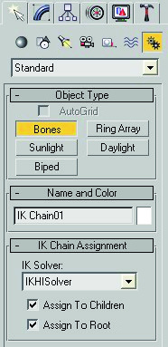 Para crear los Solver de una sola vez sin tener que acudir al menú animatión. Vamos a create-system-Bones, en la persiana ique chain assignment elegimos ikhisolver y marcamos assing todo children. Y comenzamos a crear la cadena de huesos en los visores.