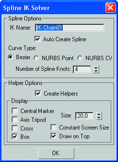 Para crear una Spline i. K, elegimos en IK Solver splineiksolver, cuando hemos terminado de hacer la cadena sale una ventana.