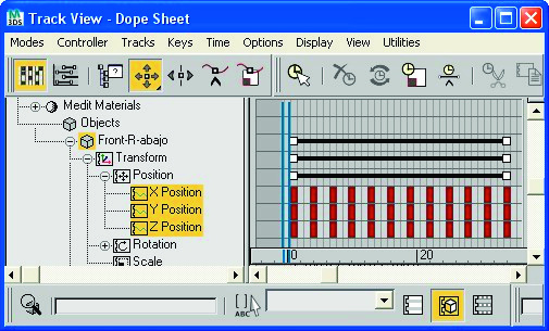 3- Animamos una de las patas por medio de su ayudante. Las keys que tengo seleccionadas en blanco representan cuando la pata esta apoyada en el suelo. El ciclo es 1ª key apoyado, 2º key levantándose, 3º key avanzando y 4º key apoyado. Volvemos a copiar este mismo key un poco más adelante para que la pata siga en suposición última, y volvemos a repetir el ciclo.