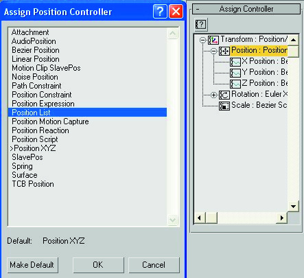 2- Seleccionamos la esfera, vamos al icono de motion persiana assing controller. Nos ponemos encima del controlador position, el botón de la interrogación se pondrá activo y le damos. En la ventana que se abre seleccionamos position list.