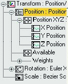 Al hacer esto una de las cosa que suceden, es que la esfera se introduce dentro de la caja, no podemos moverla. Para ello necesitamos insertar un controlador de position XYZ. Seleccionamos el available que tendremos siempre libre por defecto, y dando a la interrogación añadimos position XYZ de la ventana que se abre.