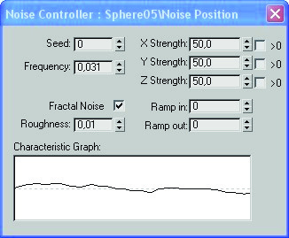 3- En la esfera en el available insertamos un noise position, y podemos cambiar los valores para que la línea horizontal se más irregular o menos, esta línea afectara al movimiento de la esfera.