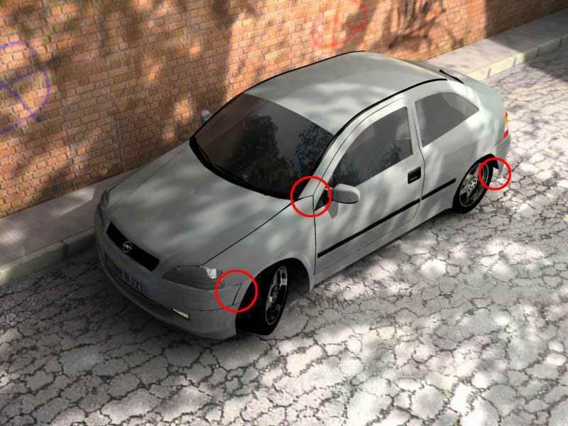 En principio no está mal, pero: Mm no se ¿esta texturizada la chapa? O es solo un gris de prueba. Fíjate en las marcas que te he realizado, veo esas zonas un poco extrañas.