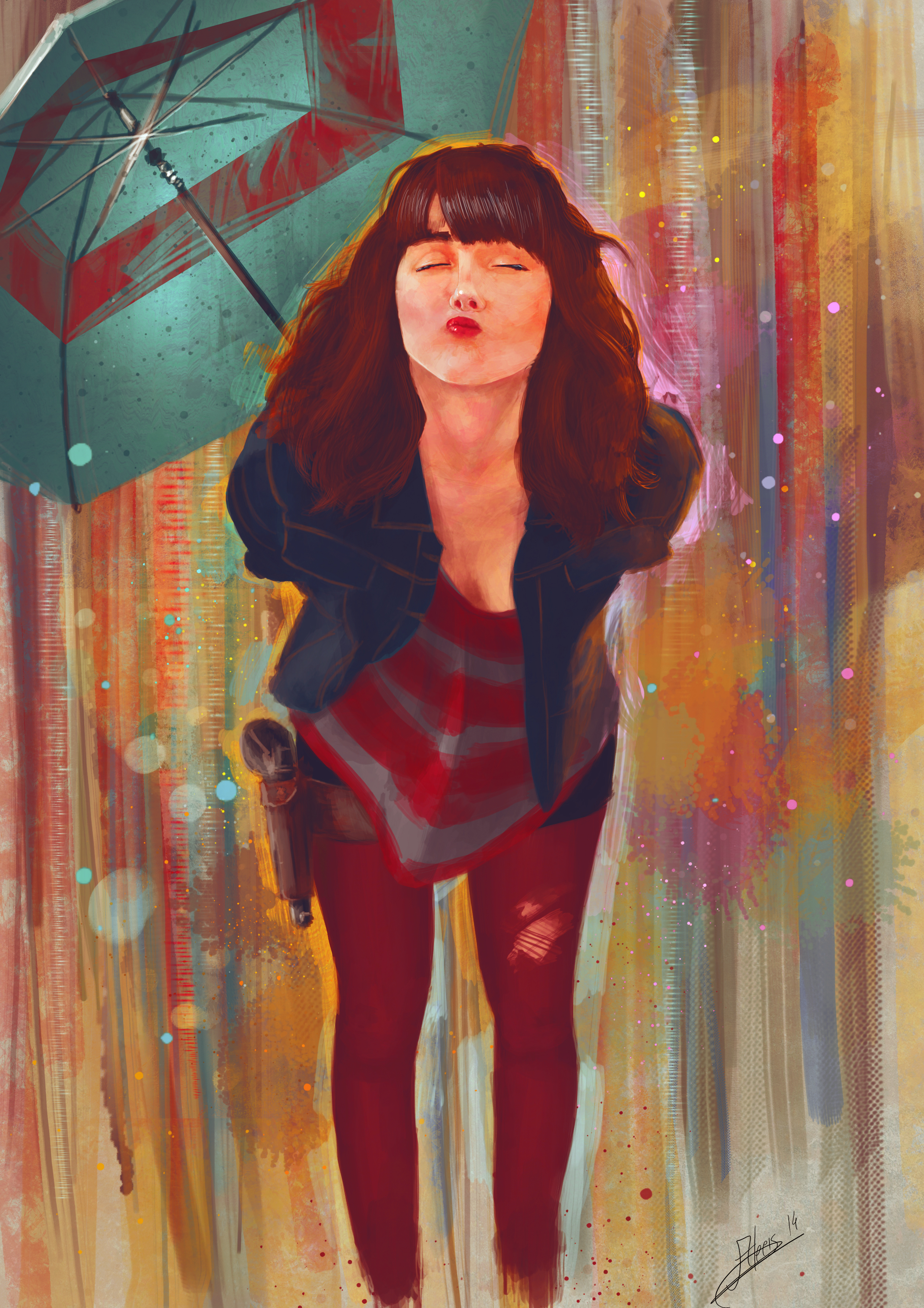 Después está el paraguas: el color armoniza, pero me parece demasiado geométrico que junto con esos toques hiperrealistas de las luces (varillas, bastón) no me pegan con el resto, se me va el ojo demasiado hacia ahí y no me da la sensación de que la chica lo sostenga, quizás la perspectiva o la modelo, que no me lleva hacia él.