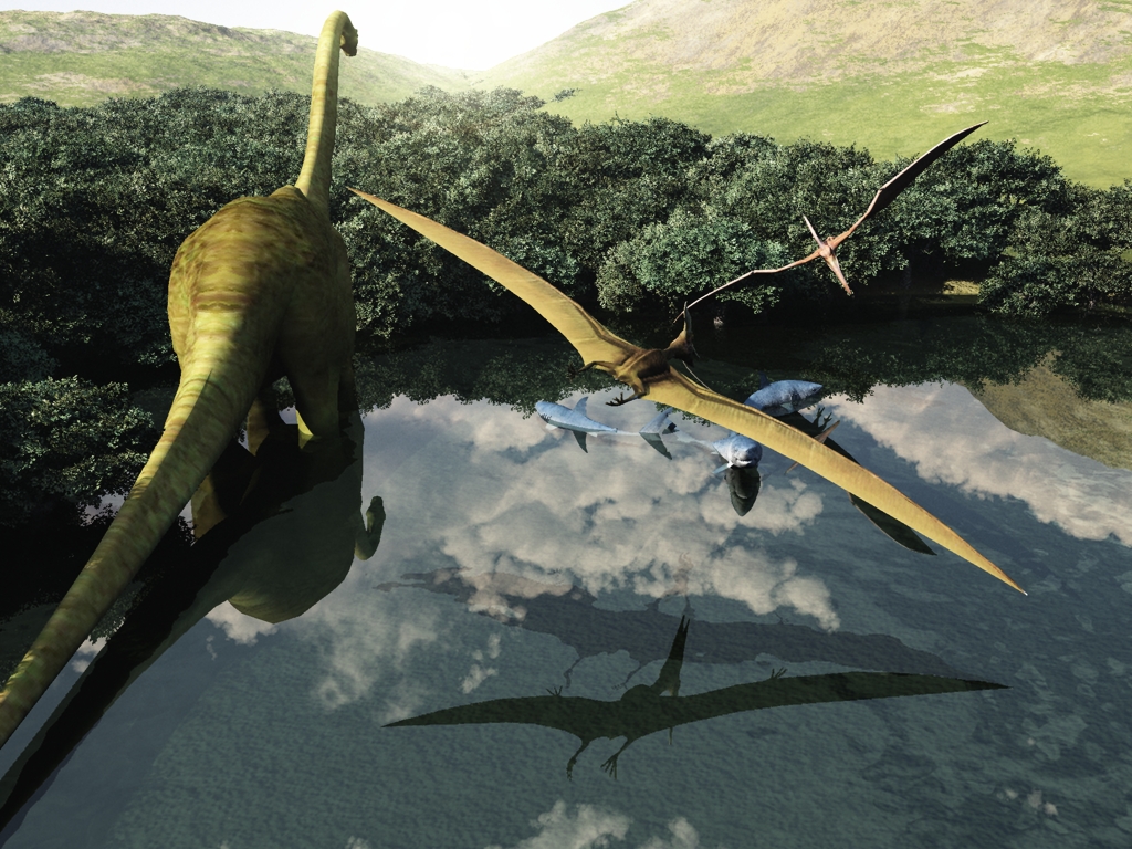 A mí me gusta la realización, pero se puede mejorar. Con este brachiosaurio (o cómo se llama)tan grande y estos tiburones que se mueven el agua tiene que tener más movimiento porque ahora es muy tranquilla. Uno de los 2 pterodactyles lo puedes alejar más atrás y cambiarle un poco la posición porque ajora mismo parece que van ha chokar una contra el otro. También la posición de los tiburones no me convence teniendo los tres juntos. Probablemente quedará mejor si les cambias un poco de posición para dar más variedad. Por ejemplo, poner uno más hacia las sombras de los árboles, otro más cerca hacia ángulo derecho, o cómo a ti te gusta más. El dinosaurio grande se le nota que la textura en la espalda y la cola se le estrecha, (pasa normalmente cuando se pinta en un lado y se copia al otro y se olvida pintar la espalda y la textura se estrecha un poco, pero puede que me equivoque). Eso sí, la iluminación me gusta. Lo has hecho en vue?