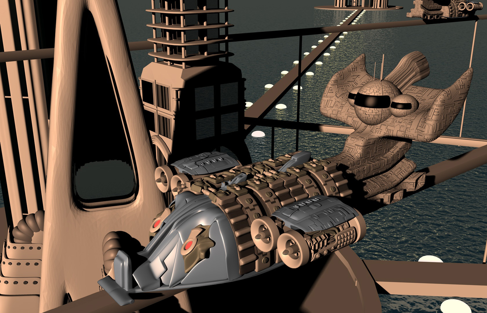 Hola, la imagen no está mal, pero hay cosas que a simple vista se ven muy mejorables. En general los materiales y texturas aplicadas hacen empobrecer tu obra, todo se ve del mismo color y poco definido o monocromático.