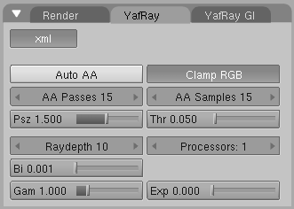 To export the scene into an xml file, all you ned todo do is todo enable the xml export, start todo render, and estop Yafray the momento it is finished with loading the scene and starting todo render(chek the terminal window for this during rendering). Open the xml file in any text editor and enter the following Shader información into your xml file.
