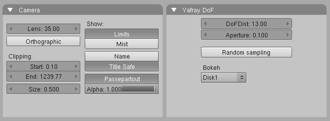 Another very important tool for product shots is the Depth of Field. This effect is very useful, todo bring attention todo the specific elements of my work, while other elements are blurred. Yafray supports true Dof, which with higher sample values Will produce very Smooth results. The render time Will obviously increase with the amount of samples, but the end result is more than worth it. The Dof settings can be accessed from within Blender. An apertura value of 0.1 todo 0.5 is suficient. To gain a Smooth Dof rendering, in the render settings you ned todo disable auto a. Depending on the scene you have todo adjust the a settings, in my scene i used 15 * 15 for a passes and a samples.