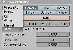 Aquí puedes modificar el comportamiento, si presionas el botón ad, en el panel fluid simulation, en la parte inferior del mismo panel aparece un cuadro con opciones, Gravity, y ahí hay varias opciones de viscosidad.