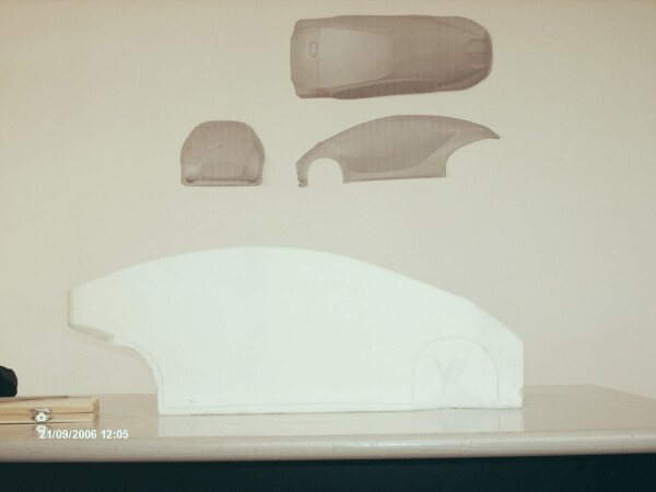 Another trik in which Blender helped me, was preparing cardboard templates of some given body sections. I subdivided the whole length of the xv in 12 sections and Cut the car body After those sections. After rendering each section Cutout, scaling them in the Gimp and then printing, we only have todo stick each section on a cardboard piece and carefully Cut the hollow part. After this operation, the only thing todo do remains Marking the sections on the working board according todo the distances of the sections we have in Blender, so we can place the right section at the right distance todo chek the work progress.