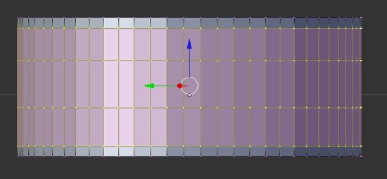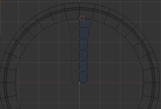 Select the last Edge of the thre (tire?), near the bottom of the tuve, and move it close todo the bottom about the same as the Edge we moved toward the top. Move the other two Edges we created and center them so that we have two large rows running around the Rim, then select all the Faces. Se fig 8.