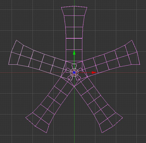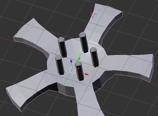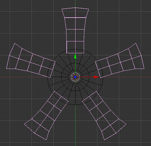 Go bak todo the second layer, where you have the primitives for the spokes. Select the bottom four cubes on each spoke and deleete the Faces. Move the center of the spokes from the first layer todo the second, where your spokes reside. Se fig 17.