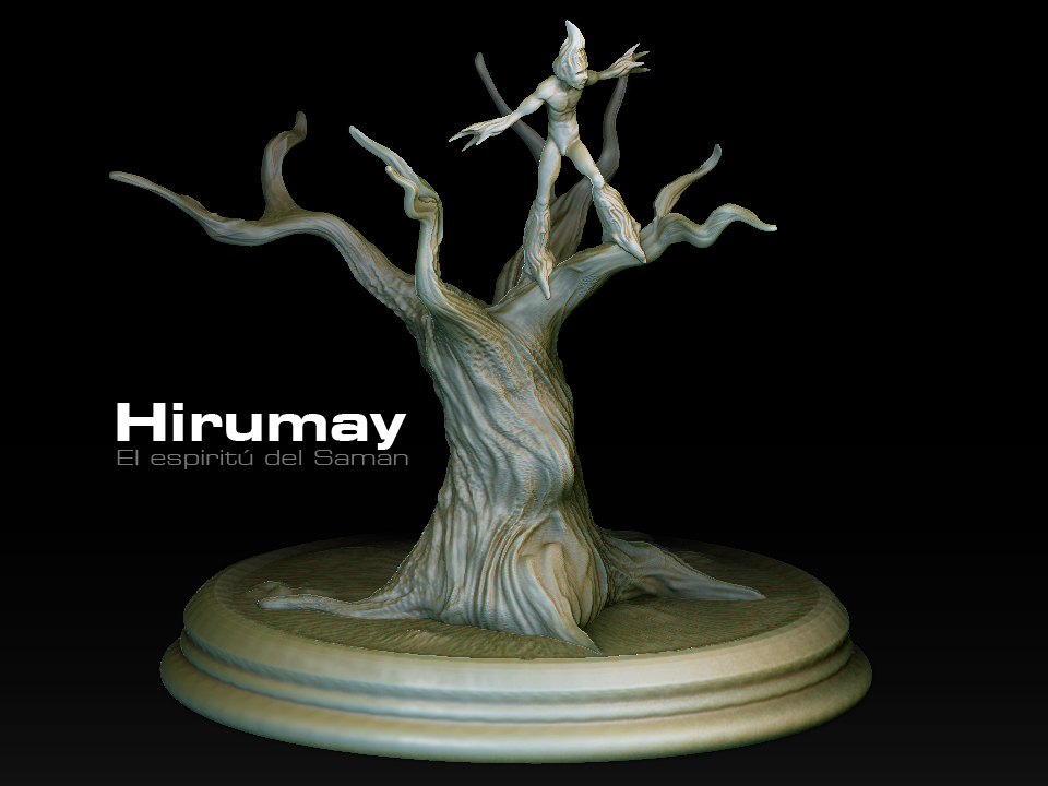 Todo el modelo tiene unas 15 horas de trabajo en dos días, modelo del personaje en Wing 3d, y el del árbol y la base con zpheras de ZBrush, la imagen a color es un overpainting (creo que he estado viendo mucho el trabajo de kmk37).