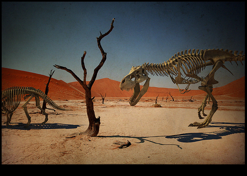Las sombras de los dinosaurios están demasiado azuladas en comparación con las de la fotografía. Simplemente eso, la tonalidad. Por lo demás me parece una buena integración.