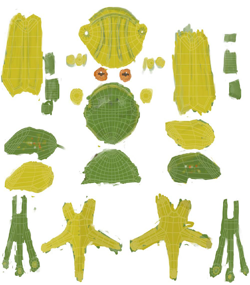 To create the texture, y used the classic UV export script and i Painted the texture in Gimp using a Wacom tablet. The texture style is very spontaneous and lose, rather than elaborate, because i decided todo se what would happen After the render and postproducción phase.