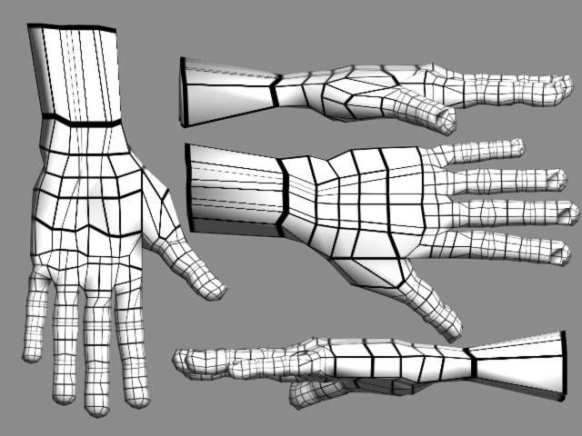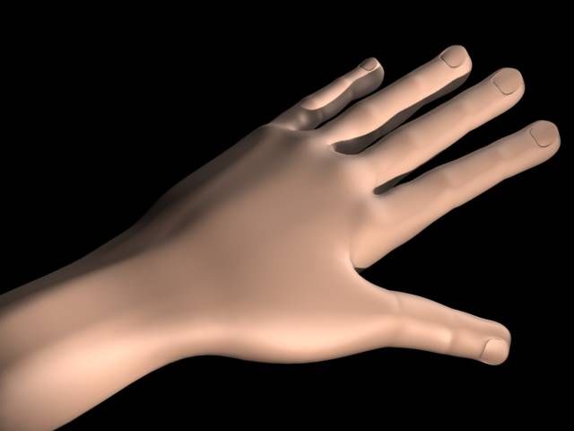 Pues he intentado hacer mi primera mano, no me convence mucho, la uña la veo muy mal y la forma en general de la palma está bastante amorfa, tendría que mover aún muchos vértices, otra cosa, voy yo de listo y al comienzo de los dedos (que salen de la palma) le pongo 6 vértices te a los dedos le pongo 10 y claro, a la hora de unir, malla, especialidad de la casa. En fin, que el meñique es enano, y bueno que sois vosotros lo que tenéis que criticar, así que, me cayo algunas, ah, no he usado referencias, ala, a pelo, alegría, así sale, y he medio usado la técnica de esta web.