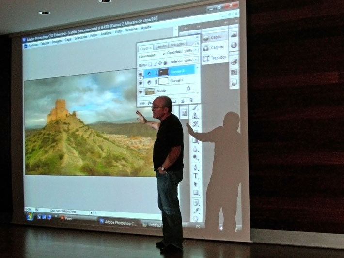 Bueno, después de la primera de las charlas programadas con motivo de la exposición de arte digital he de decir que fue un éxito rotundo de asistencia de público, más de 120 personas se dieron cita en la charla del fotógrafo domingo Leiva que en algunos momentos dejó alucinando al personal con lo enrevesado de su método de trabajo, el procesado por zonas, que en algunos casos llegó a necesitar más de 200 capas de Photoshop, un monstruo el tío.