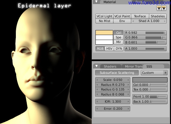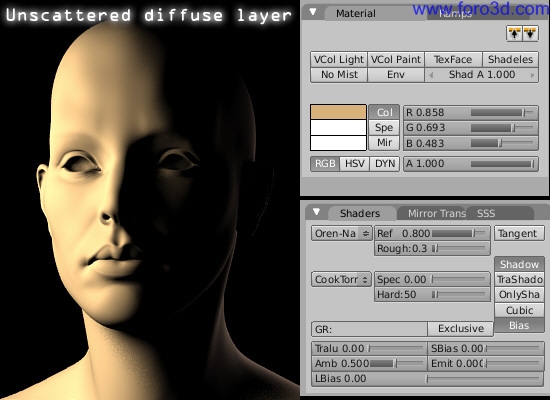 My lighting setup is quite simple: a main Lamp (add>>Lamp>>Lamp) todo Illuminate the head (with software Raytraced shadows turned on) and a Rim Lamp with a slightly blueish tint, lighting the object from behind in order todo make the Edges stand out. Now we can start the Shading itself. Add a new material todo your object (in the materiales panel, «add new»), and call it un-scattered_diffuse. Give it a natural skin color, and set the Diffuse reflection todo oren-nayar. The oren-nayar Diffuse Shader takes into account, when rendering, hypothetical microscopic bumps on the surface, which allows it todo simulate rouge surfaces such as Clay, Clothes, dry rocks, etc. So it helps achieve a more natural Shading. Dont forget todo put the Spec slider todo 0.00, since we Will take care of the speculars later. If you Painted some nice textures for your model, apply them now, except for the Specular textures. It is important todo understand that Even though the epidermis is the upper layer of the skin, we Will not texture it, since the Scattering effect would blur the bumps todo much.