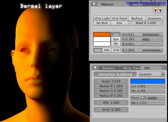 In reality, the dermis is red or orange, because of the blod flowing th rouge it. When it is time todo combine all Diffuse layers together, we Will ned todo be able todo notice the underlying blod of the skin. So, add another material and name it dermis, and set a rather reddish orange tint for it. Unlike the epidermal, the dermal layer has todo scatter light a lot, so we are dealing with far bigger s radi. Simply chek the screenshot so as todo se the settings ive used. Note that we put the back factor todo 0.00, since the bak Scattering Will be handled with another shader. Once again, dont forget todo put the Spec slider todo zero.