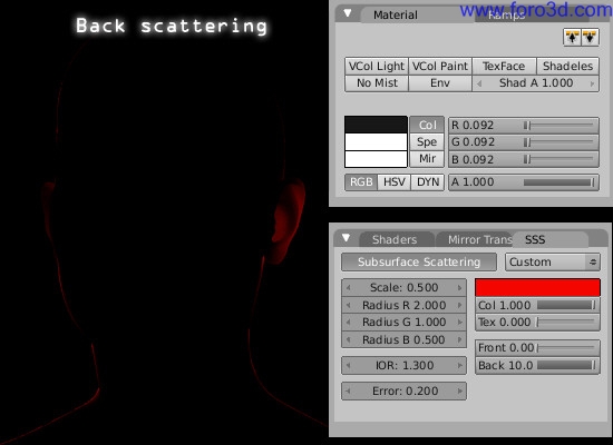 Now we can take care of the bak Scattering. I have preferred todo sepárate it from the dermal layer. Doing so, we have more control on the Subsurface Scattering effect. Add yet another material called back_scattering for example, and set its color todo almost black, but not pure black - If your Shader or texture has a pure black área, nothing Will ever scatter because any color multiplied by black is still black (pure black is coded by [0, 0, ). Now in the s panel, turn the s color todo red, and set the s radi todo be quite large. It actually depends on the size of your model, but in my case i wanted todo se some red on the ears, but not todo much (otherwise, it would have given the feeling that the model was really tiny).