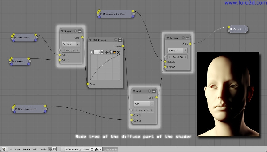 Let start: add another material called combined_shaders, and turn on the node button. Open the material nodes editor, and within the editor load each material we created previously, using [spac>>add>>input>>material. Do it four times, and for each node assing one of the skin materiales. Now it time todo mix all of the layers together. Add a screen operator using [spac>>add>>color>>mix and change the mixing method todo screen instead of mix. Now, enlace the epidermis todo the first input of the screen operator, and enlace the dermis todo the second input. Leave the mix factor at the default value, which is 0.50. Now you can do the same with the back_scattering material, using an add operator this time.