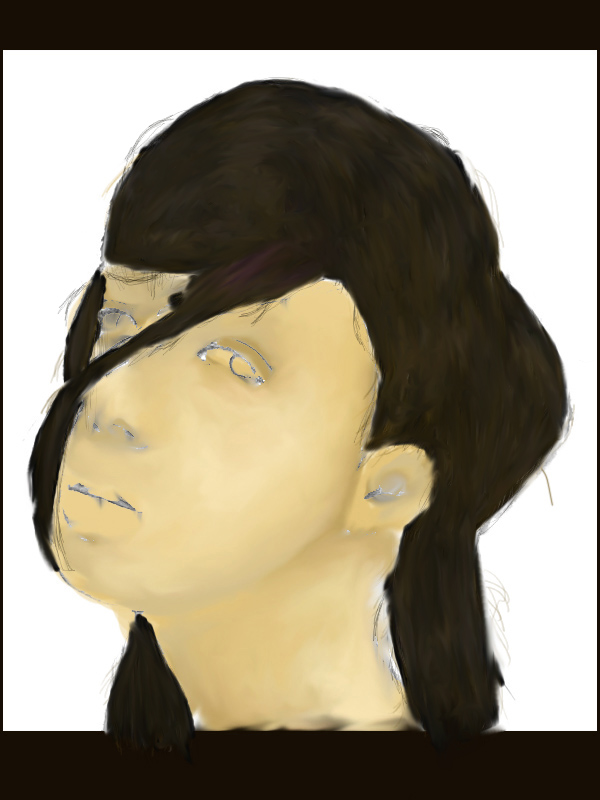 El pelo es una masa suave, lo que cae encima de la cara es demasiado espeso, no está bien hecho. Te aconsejo que te pases por YouTube y mires speed painting en Adobe Photoshop, ahí verás métodos de pintar en Adobe Photoshop.