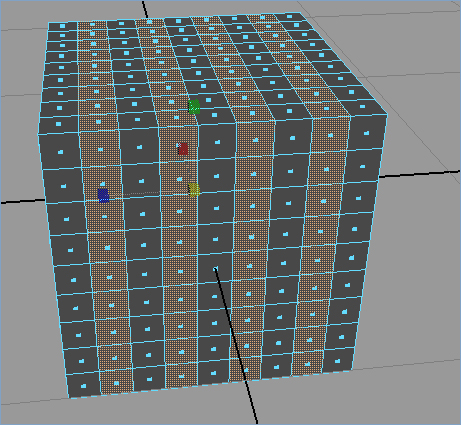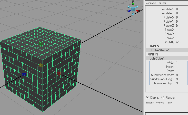 Si tocamos el primer icono, abriremos el attribute editor. En este editor tendremos todos los atributos de un objeto, todos los valores, y todo lo que necesitamos saber para editarlo. Este editor esta divido en solapas, que son nodos conectados a este objeto. En Maya, todo funciona por nodos y por conexiones. El segundo icono es el tool editor, que se activa cada vez que seleccionamos una herramienta. Un ejemplo de herramienta es la herramienta move, rotate o scale. Una herramienta nos sirve para editar objetos. Contiene todos los valores que podemos cambiarle a la herramienta para lograr el efecto deseado con la misma. Y por último, el tercer icono es el Channel Box, un editor muy utilizado (y el que prefiero). Este editor es una versión limitada del attribute editor, y contiene ciertos atributos que podemos cambiar. Lo bueno de esto es que es muy accesible, y muy fácil de manejar. Con esto explicado, abrimos el Channel Box con el cubo seleccionado, y buscamos subdivisións height, subdivisións width y subdivions depth, y cambiamos estos tres a 9.