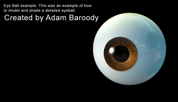 Here the eye. This eye is more of a Pixarish kind of eye in that its clean looking. Additional texture maps can make this eye more photo real, such as a pinkish map with some small vein like lines. I like the Pixar look so that the Inspiration for this eye and its Shaders.