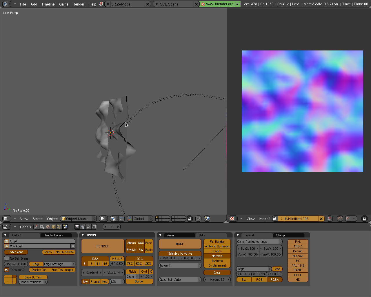 El mapa de normales es un mapa de Bump, pero mejorado, en vez de escala de grises utiliza esos colorines, así que, el modelo sigue siendo plano salvo en el render. Yo aún no he descubierto cómo sacar el relieve en el visor con gl, pero eso es lo de menos, tienes la preview.