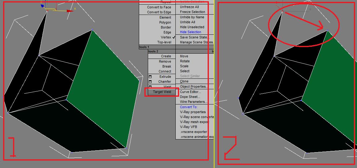 Simplemente seleccione tu Maya y dale al botón derecho del mouse, seleccionar target weld y luego seleccionar un punto a soldar luego veras que el cursor tendrá una línea para indicarte con que otro punto deseas soldarlo, dale al otro punto y se lograra la operación. Pero asegúrate de seleccionar bien el punto.