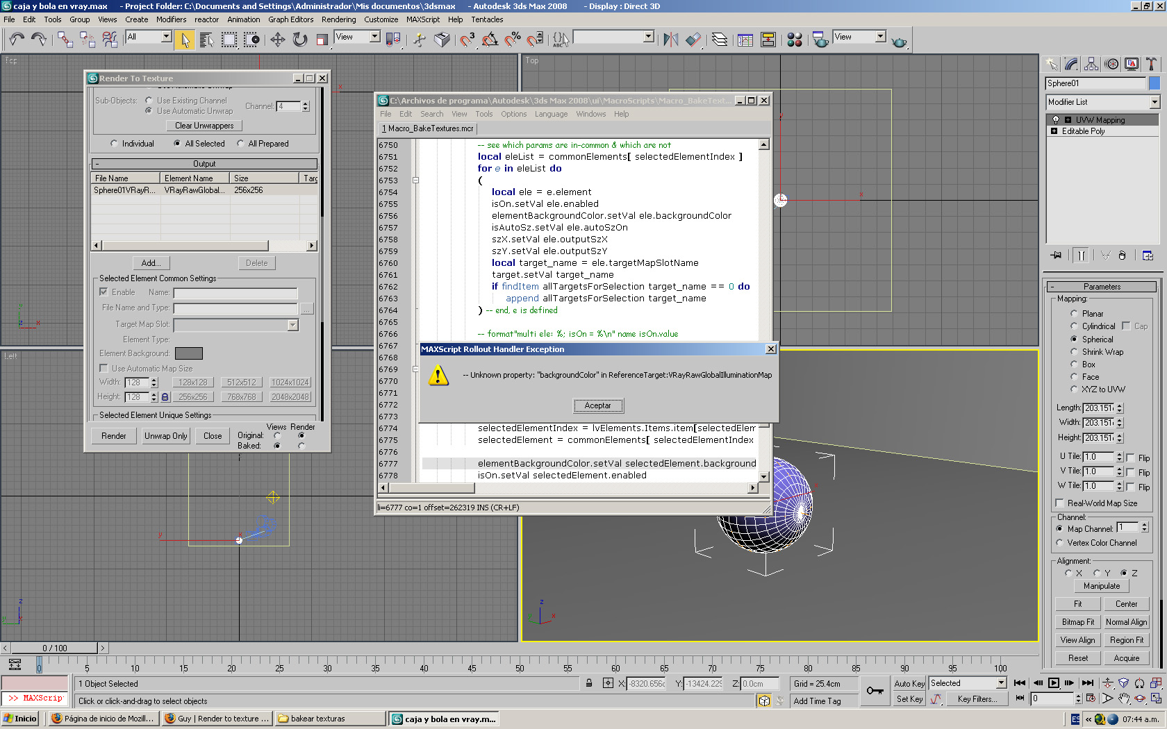 Estoy intentando bakear las texturas de una caja y una bola renderizadas con Vray 1.50sp1 en 3dsmax 2008 y cuando escojo cualquiera de los mapas Vray como Vray complete map me sale está pantalla y se bloquea.